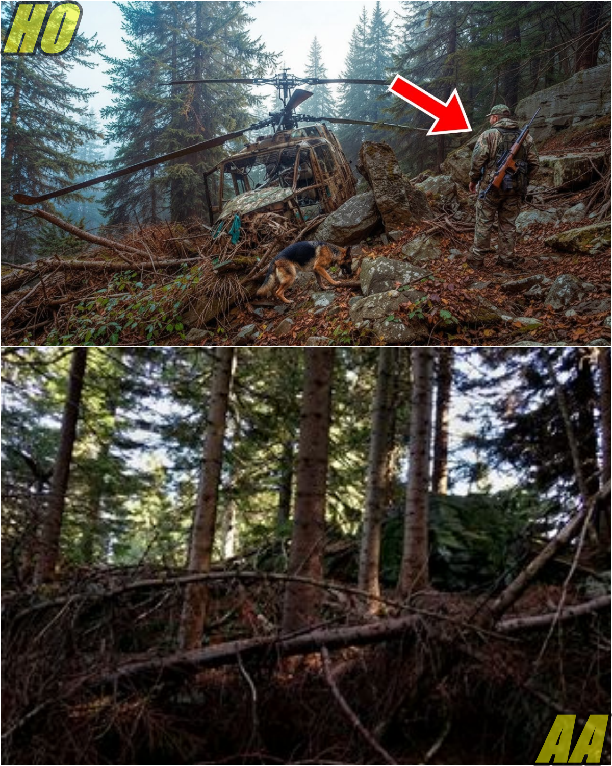 At dawn, Bear was restless, moving with nervous focus. They followed a narrow ridge into thicker timber, where even the wind seemed to avoid the place. Suddenly, Bear bolted downslope, barking sharply. Dan followed, sliding through fog until he saw it: a massive shape of metal half-buried in the earth, covered in vines and moss. A helicopter. Military markings faded by rust. USA R—US Army.