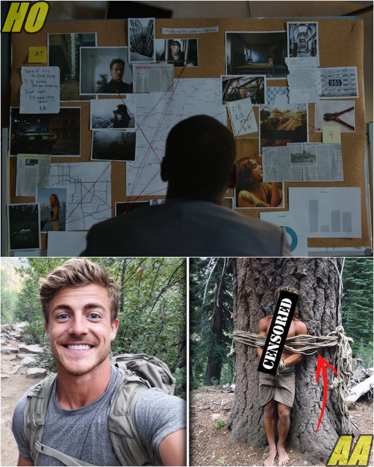On the wall, a sheet of polyethylene was nailed up, covered with newspaper clippings, forum posts, and maps about missing hikers. In the center was a recent photo: Richie, tied to the pine, taken just before he was found.
